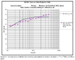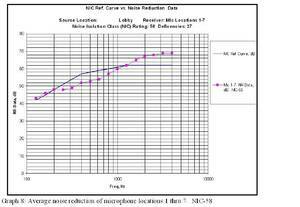 Test 1: The Noise Isolation Class (NIC) ratings (NIC rating was calculated in accordance with ASTM 413) for this series of tests were conducted between the theater lobby (sound source side) and the adjacent office space (sound receiving side). The NIC results ranged from an NIC-57 to NIC-59 and included 7 microphone locations in the office space. NIC ratings of this level are considered acceptable for typical noise levels generated between the theater lobby and adjacent office space. This range of NIC results would be estimated to translate to STC (Sound Transmission Loss) performance levels in the low to high 60’s. It should be noted that while NIC ratings of this level are considered adequate, they do not assure a sound proof environment. As noise levels increase there will always be a possibility that some level of noise transmission to the adjacent space can occur, especially in the low frequency range.