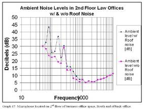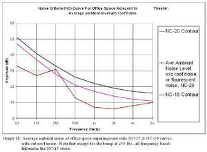Noise Criterion Curves (NC) are a series of standard curves of octave-band sound spectra in a system for rating the noisiness of an indoor space; a measured octave-band spectrum is compared with this set of curves to determine the NC level in the space. The determiner is the highest NC curve tangent to the noise spectrum. The lower the number, the lower the noise floor. Expectable levels for executive offices are NC 25-30. The average ambient noise level of the office space next to the theater without the roof noise was NC-20 as indicated in graph 18. This equals an approximate A-weighted sound level of 23-28 dB. With the introduction of an electronic masking system to raise the ambient noise floor levels, small noise introductions would become unnoticeable.